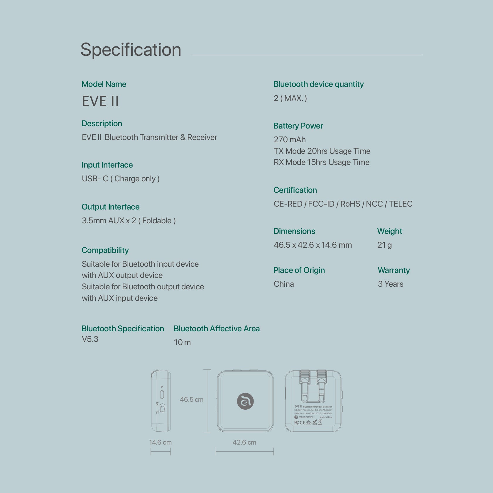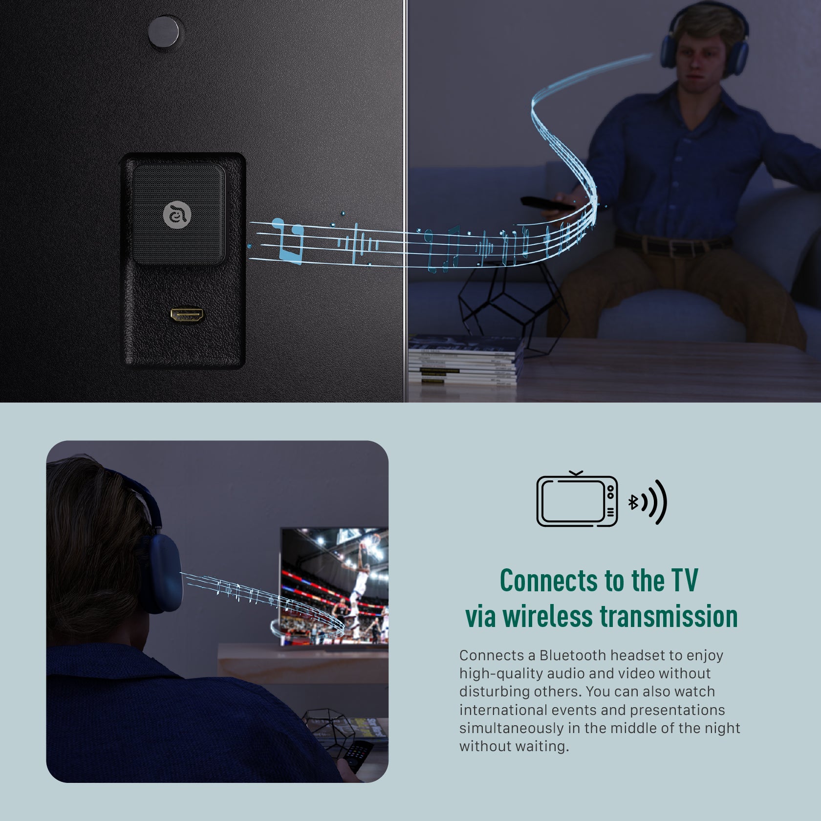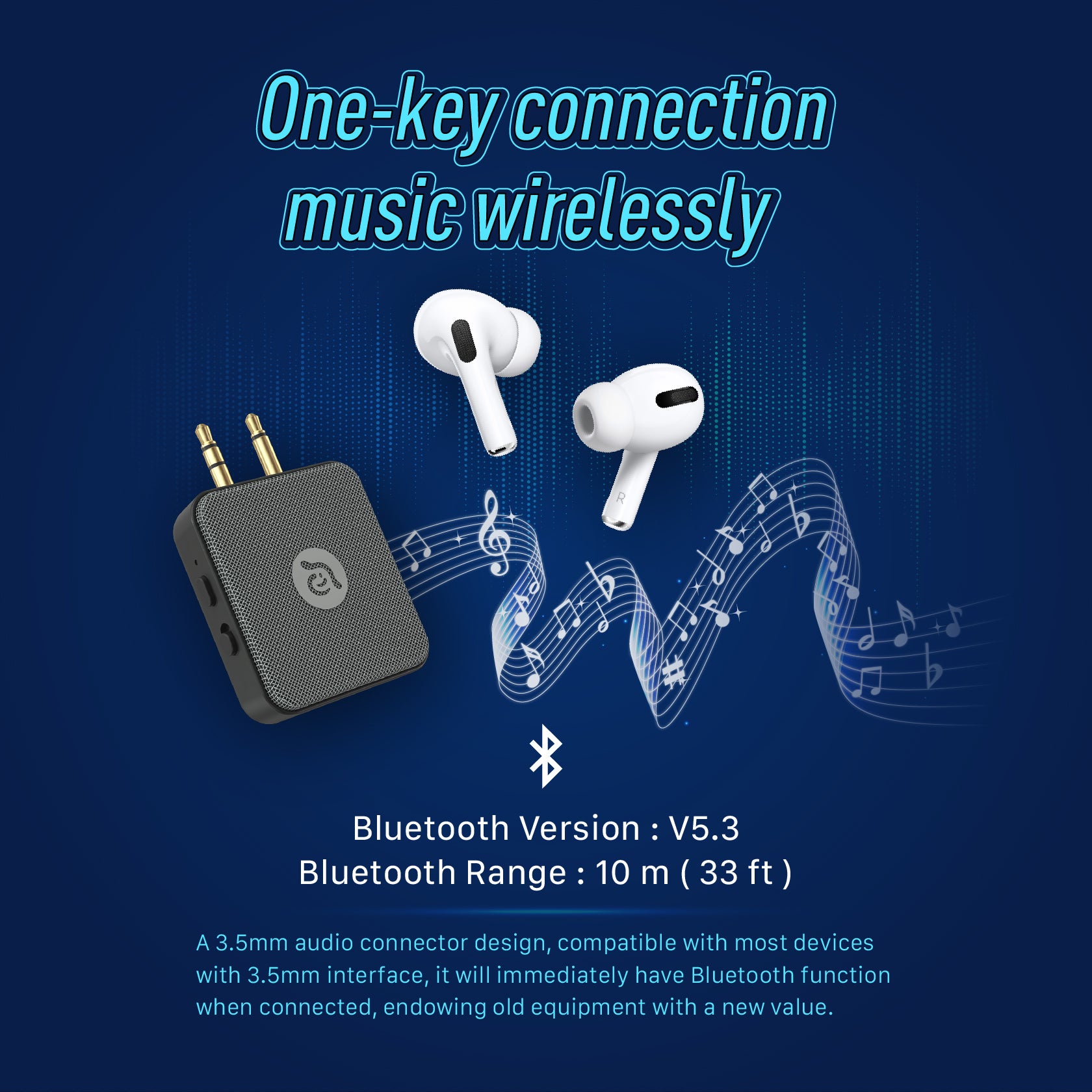 Improved wireless range up to 33ft (10m) with stable, high-quality audio. Pairs with two sets of Bluetooth earbuds simultaneously — perfect for shared listening.