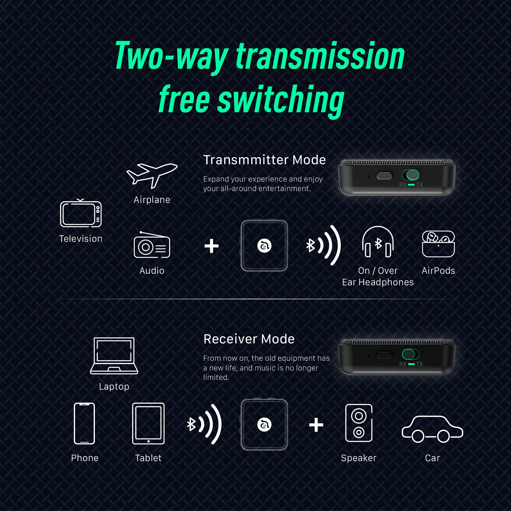 Instantly switch between transmitting from your TV, console, or stereo, and receiving on wired headphones or home speakers. (Aux-in cable required for receiver mode.