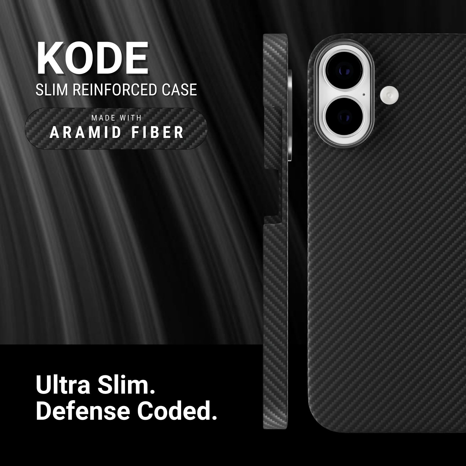 Crafted from real aramid fiber, the KODE Kevlar MagSafe Case delivers the perfect balance of slim design and tactical-grade toughness. Featuring a genuine Kevlar weave for ultra-durable texture and a laser-textured surface for anti-slip grip, KODE offers high-impact protection without the bulk. Its TPU frame and PC backing reinforce durability, while raised bezels shield your screen and camera. With an embedded MagSafe ring for secure charging and accessory compatibility, this case is built for those who demand more from every detail—resilience, function, and refined form.