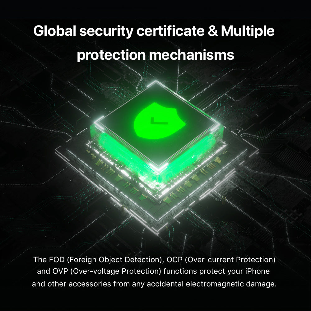 Integrated FOD, OCP, and OVP protect your devices from overcharging and electromagnetic interference.