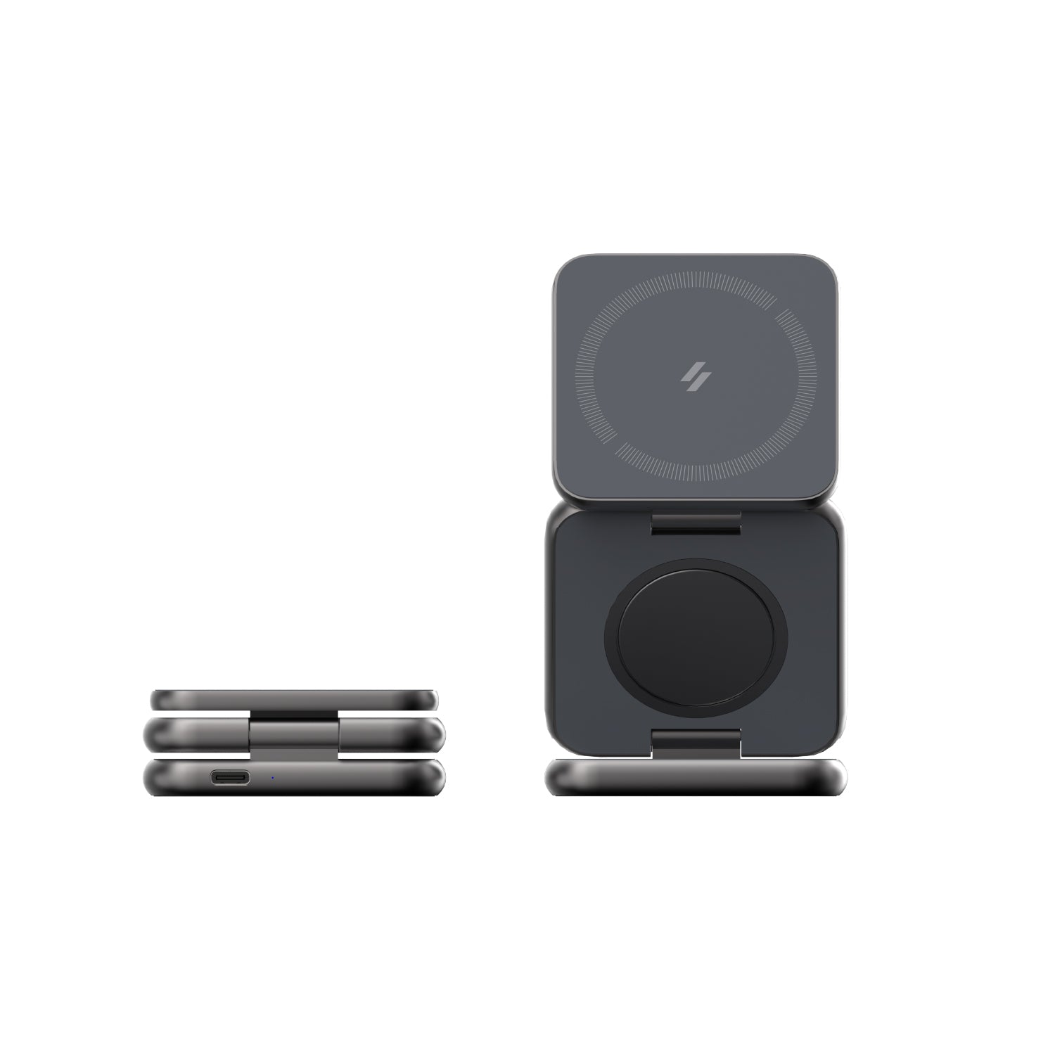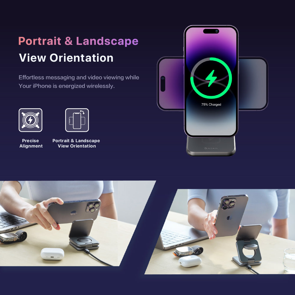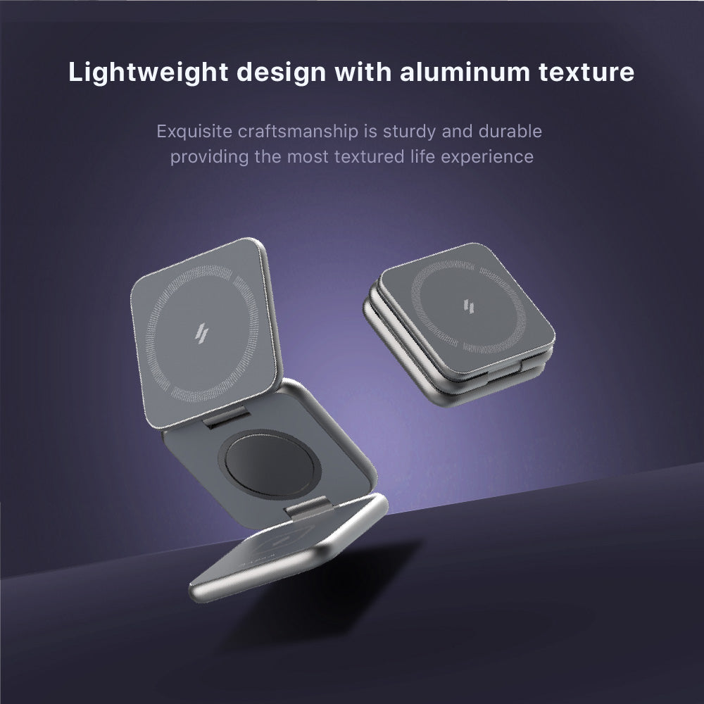 Power up in style with the Mag 3, a sleek and foldable 3-in-1 wireless charging station built for life on the move. Whether your home, at the office, or traveling, this compact charging solution powers your iPhone, Apple Watch, and AirPods simultaneously—with MagSafe-compatible precision. Designed with durable aluminum and thoughtful engineering, and folds neatly to slip into your bag or pocket. Enjoy effortless charging in portrait or landscape mode, perfect for watching videos or catching up on messages. With built-in safety features and a powerful 15W USB-C cable included, Mag 3 is your go-to charging companion for every journey.