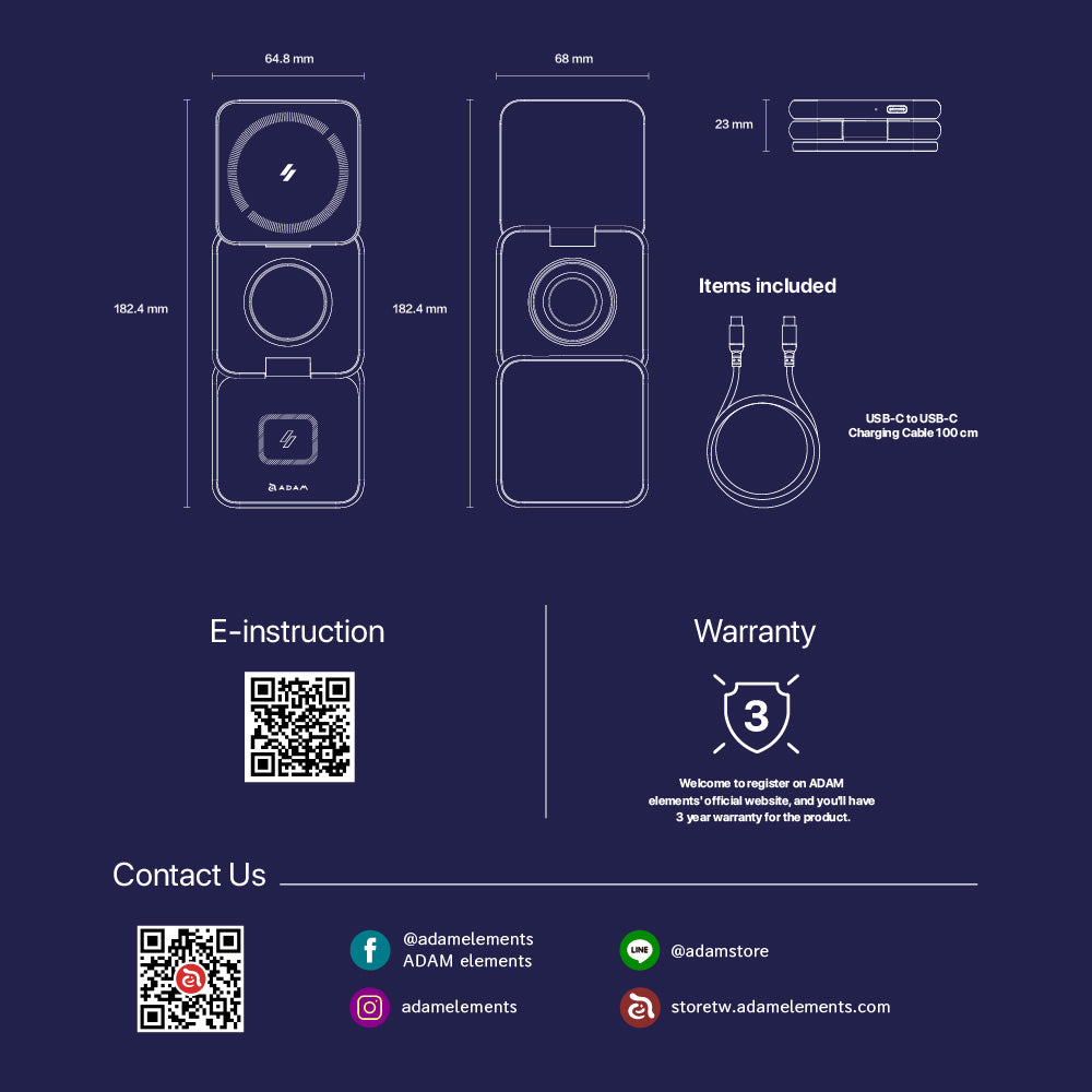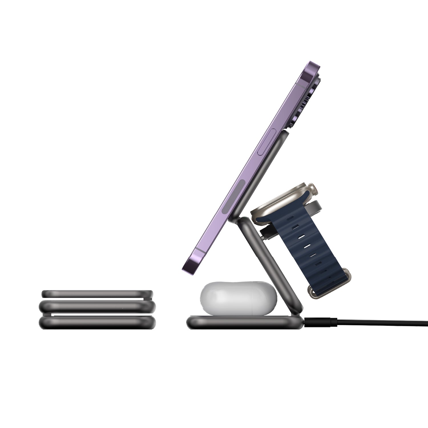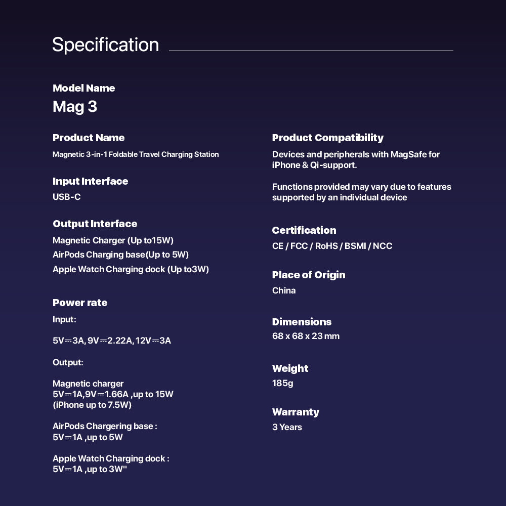 Power up in style with the Mag 3, a sleek and foldable 3-in-1 wireless charging station built for life on the move. Whether your home, at the office, or traveling, this compact charging solution powers your iPhone, Apple Watch, and AirPods simultaneously—with MagSafe-compatible precision. Designed with durable aluminum and thoughtful engineering, and folds neatly to slip into your bag or pocket. Enjoy effortless charging in portrait or landscape mode, perfect for watching videos or catching up on messages. With built-in safety features and a powerful 15W USB-C cable included, Mag 3 is your go-to charging companion for every journey.