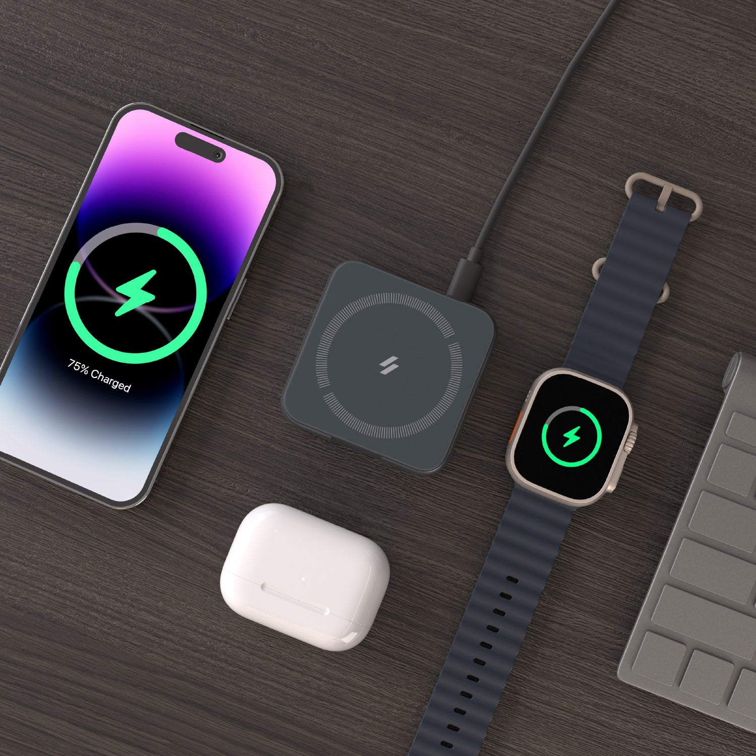 Wirelessly charge your iPhone, Apple Watch, and AirPods all at once, including AirPods MagSafe cases.