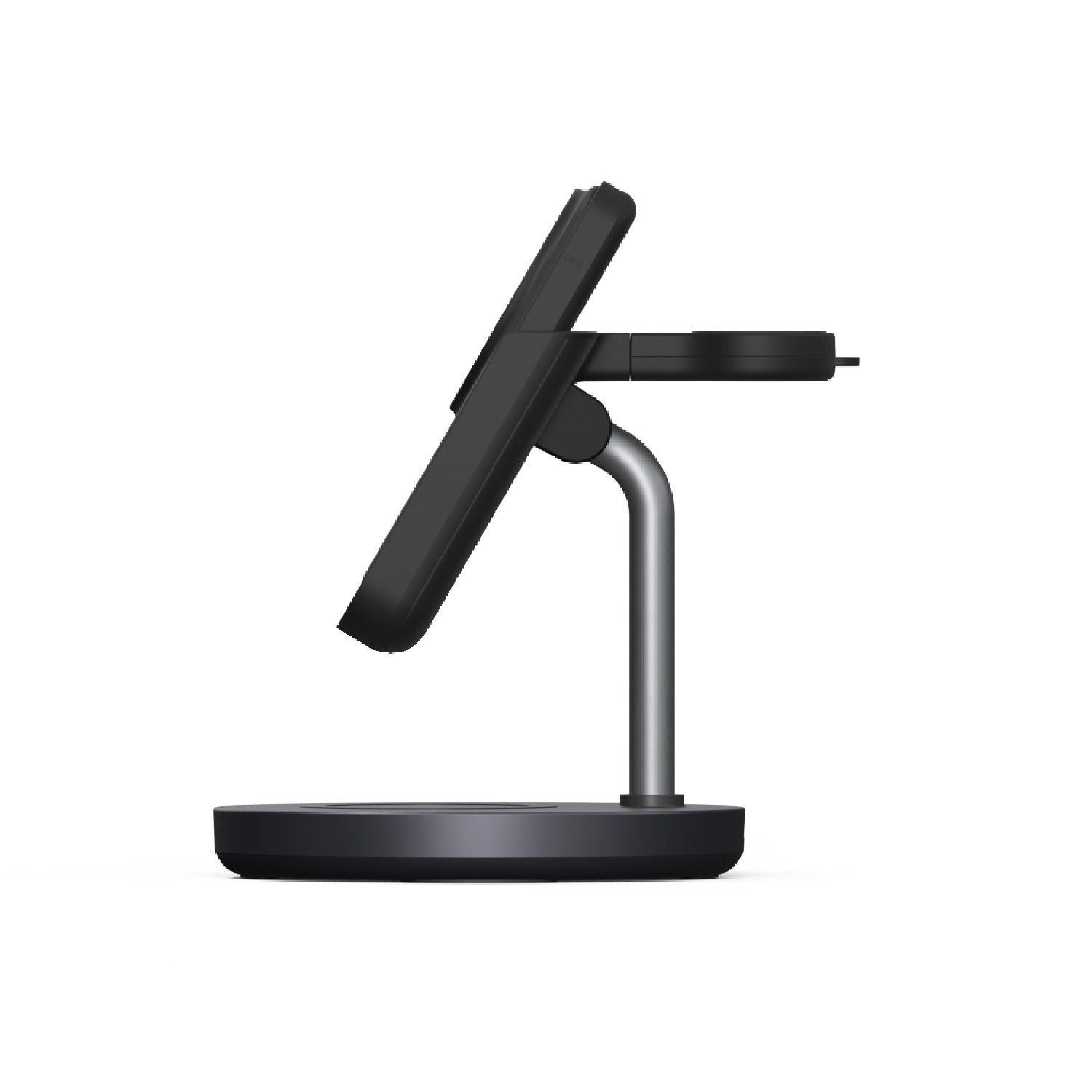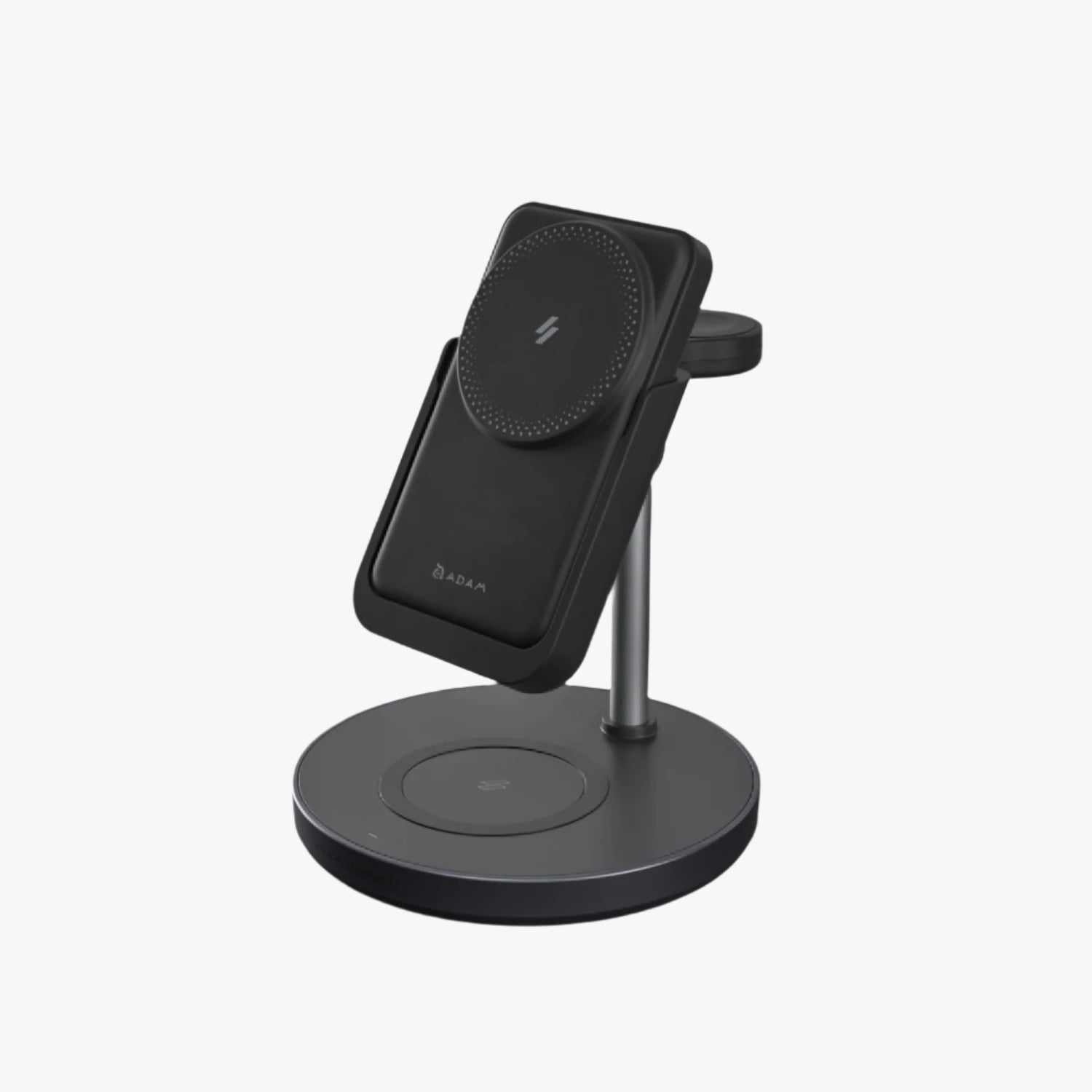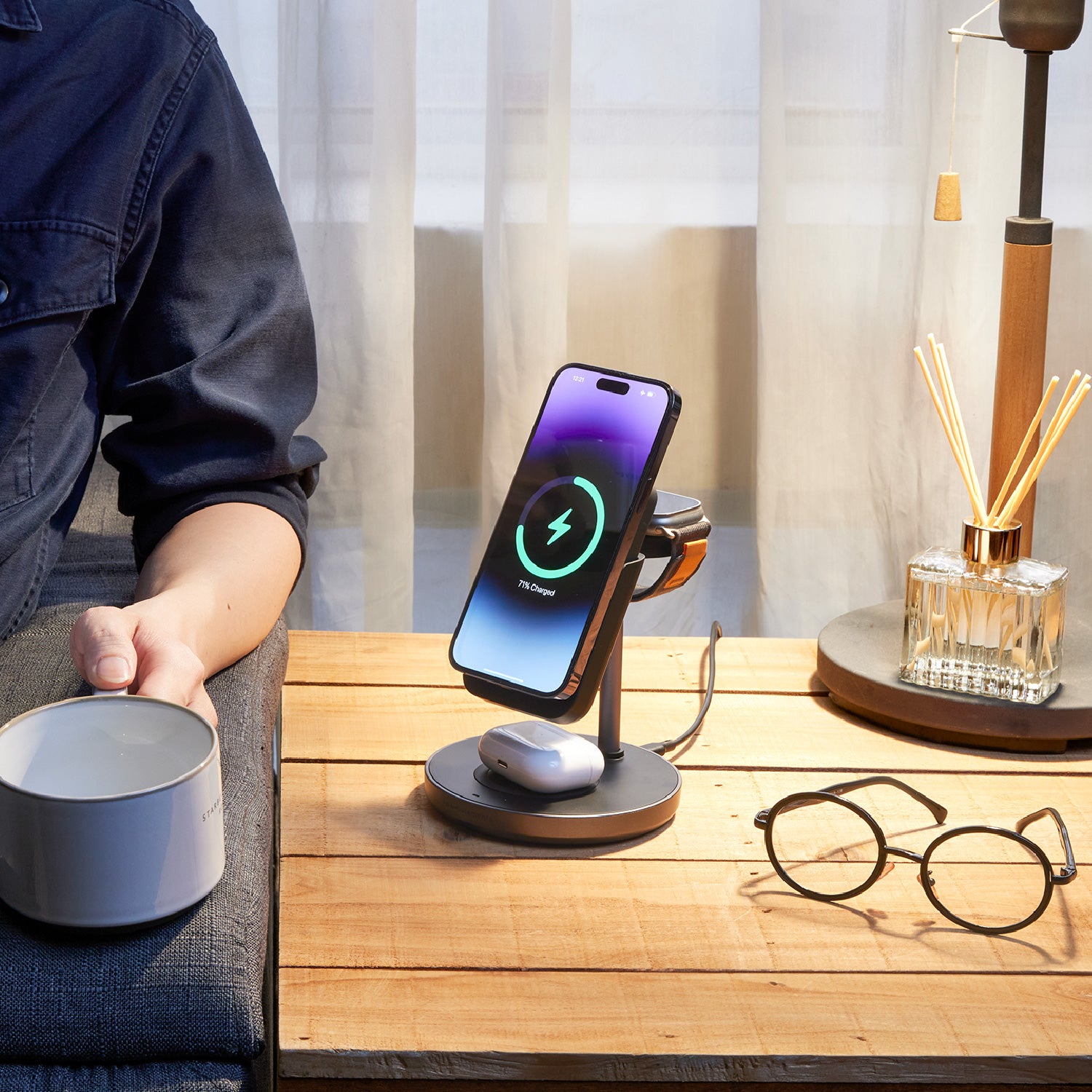 The uniquely designed magnetic power bank charges while docked and is always ready to snap onto your iPhone when you're on the move. With fast charging up to 20W via USB-C and a clever step design that keeps your camera lens unobstructed, it's a perfect on-the-go power companion. A built-in stand keeps your phone upright for easy video viewing, and the Apple Watch pad is compatible with every generation. Even your Bluetooth earphones are covered, thanks to a dedicated wireless pad.