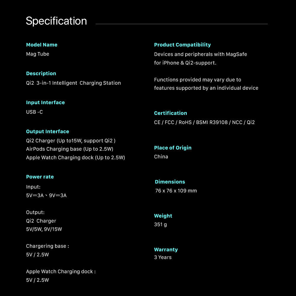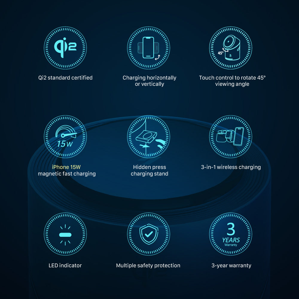 Elevate your charging experience with the Mag Tube Qi2 3-in-1 Intelligent Charging Station. Designed for Apple users, this premium charging station powers your iPhone, Apple Watch, and AirPods all in one place. Featuring a rotating wireless charging area that adjusts for the perfect viewing angle, Qi2 fast charging for double the efficiency, and a sleek metal design, the Mag Tube is the perfect blend of functionality and style. With advanced safety features like Foreign Object Detection (FOD), Over-current Protection (OCP), and Over-voltage Protection (OVP), you can charge with confidence.