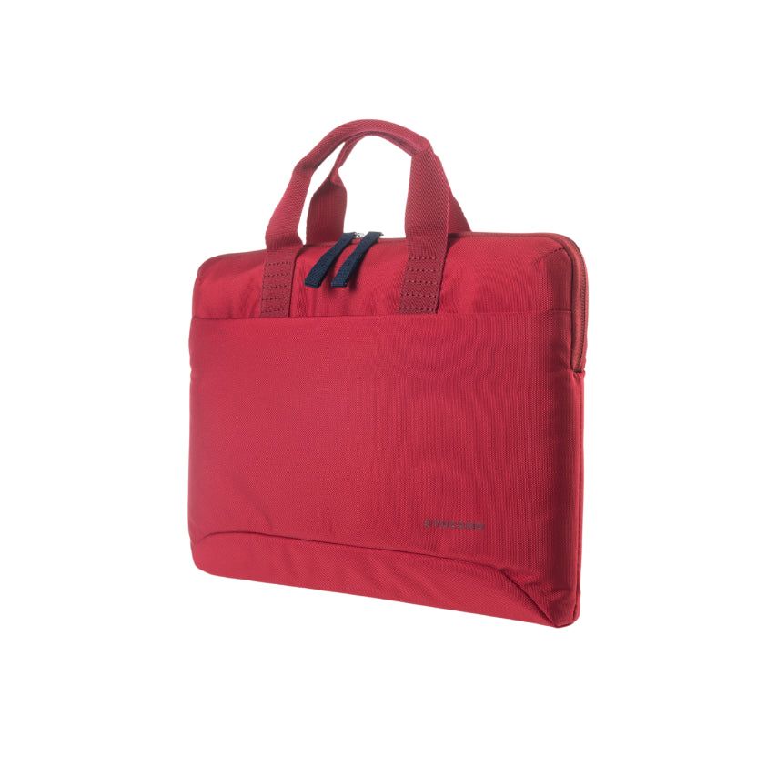 Super-slim bag for laptop 14" and MacBook Pro 14" made with fabric produced from recycled plastic with contrast-color details. Single internal compartment with neoprene corners to secure your laptop. The front side features a roomy external pocket. Double handles and detachable shoulders.